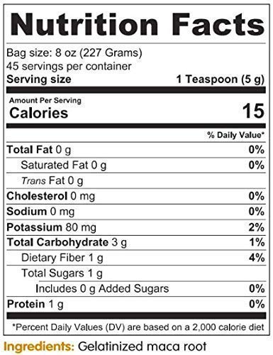Gelatinized maca powder 8oz organic nutrition facts labels of nutrition facts for gelatinized maca and raw compared home organic maca gelatinized powder organic gelatinized maca powder natural plant based high altitude superfood vegan supports. Certified organic maca powder maca is a root vegetable grown in the peruvian andes.