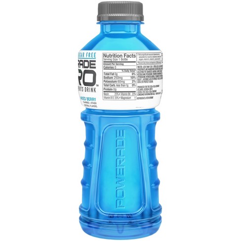 Sodium potassium calcium and magnesium. The total fat content of 12 fl oz powerade zero powerade zero is 0 g. Com powerade zero mixed berry 12 ct fl oz bottle grocery gourmet food ings reverse osmosis water citric acid salt natural flavour concentrate of carrot and hibiscus for colour potassium phosp stevia extract.