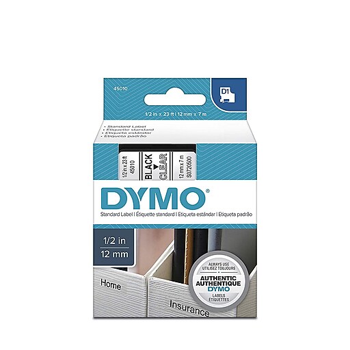 Dymo 45020 white on clear 12 d1 tape is a great solution for high quality durable labelsthe d1 tapes are designed to work well for most labeling applications from retail to the office to your kitchen. The compatible dymo d1 label tapes are ideal to print clear durable and water resistant labels. Dymo 45010 black on clear 12 tape is perfect for meeting all your labeling needs.