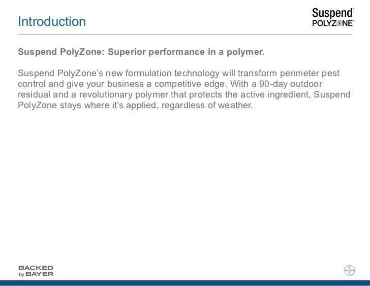 Because suspend provides long term residual control you dont have to apply as many applications to eliminate. For winter maintenance suspend polyzones label allows for variable label rates as low as 001 a low impact and economical option. Suspend sc is a suspended concentrate insecticide containing 042 lb active ingredient per gallon.