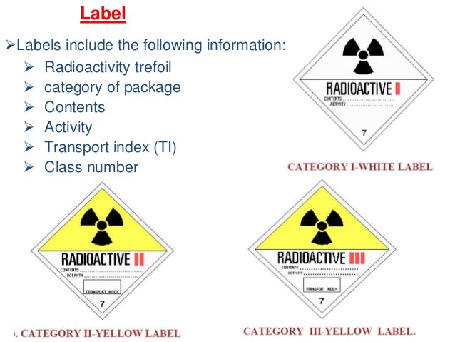 Three different labels white i yellow ii or yellow iii are used on the external surface of packages containing radioactive material. The labels are white except for the upper half of the radioactive yellow ii and radioactive yellow iii labels which are yellow. Hazard class 7 is on labels of radioactive material.