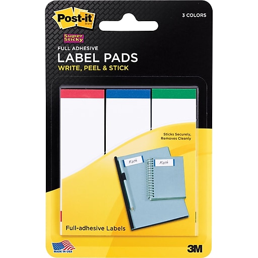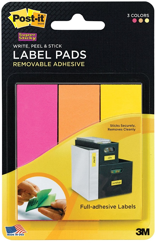 Post it label pads. Post it super sticky removable label pads sticky securely and remove cleanly. Post it super sticky label pads 1 in x 3 in white with red blue and green side color bars 3 padspack. Ships in 3 working days with free ground shipping.