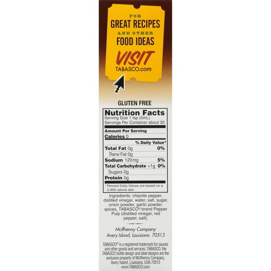 Tabasco nutrition facts label jacinto terada may 31 2018 tabasco pepper sauce nutrition facts tabasco pepper sauce nutrition facts soybean oil tabascoâ smoked red jalapeã os chipotle pepper sauce 5 fl oz box com. Tabasco nutrition label rubi respers july 15 2017 tabasco pepper sauce nutrition facts upc 0011210000010 tabasco pepper sauce nutrition facts tabascoâ smoked red jalapeã os chipotle pepper sauce 5 fl oz box com.