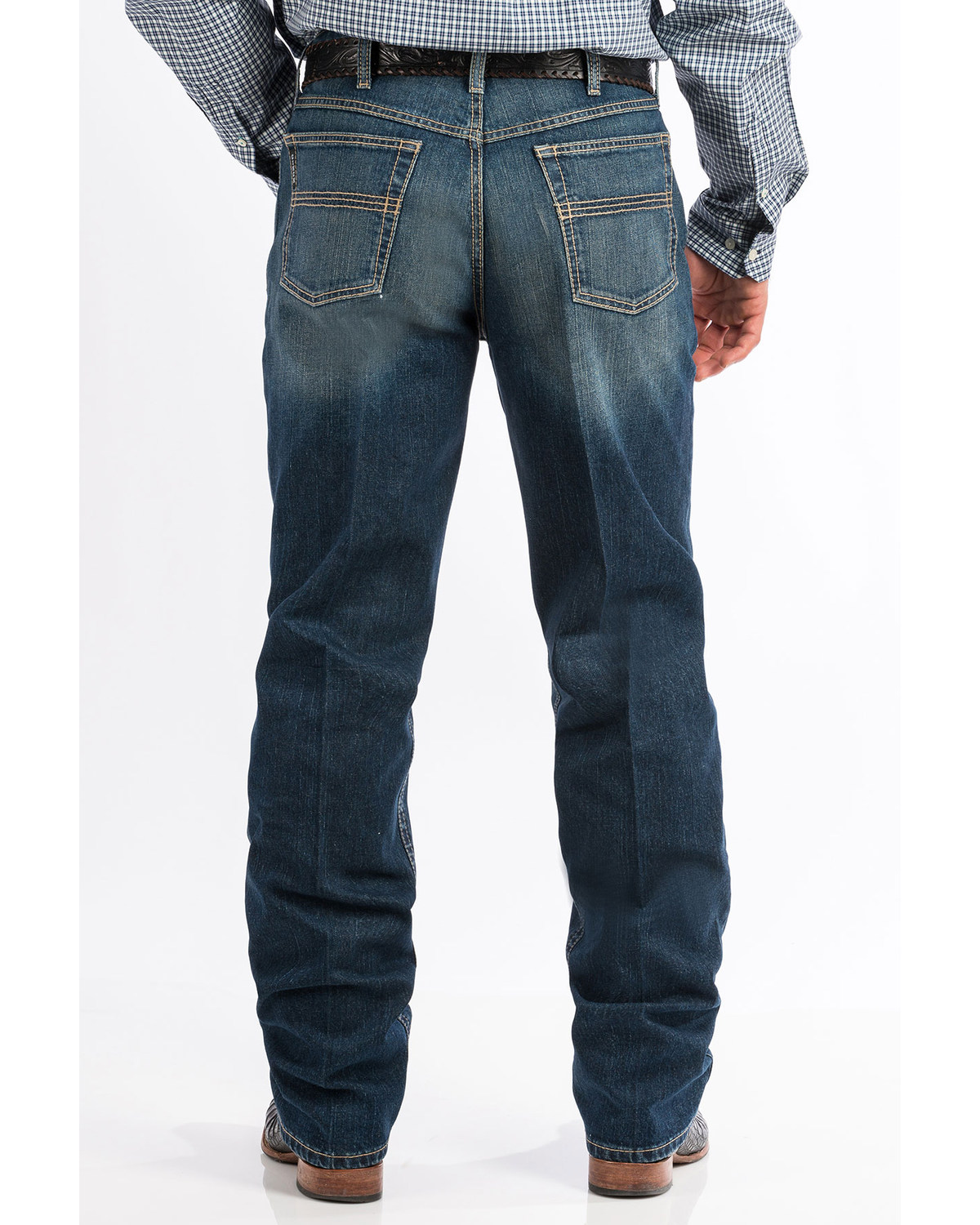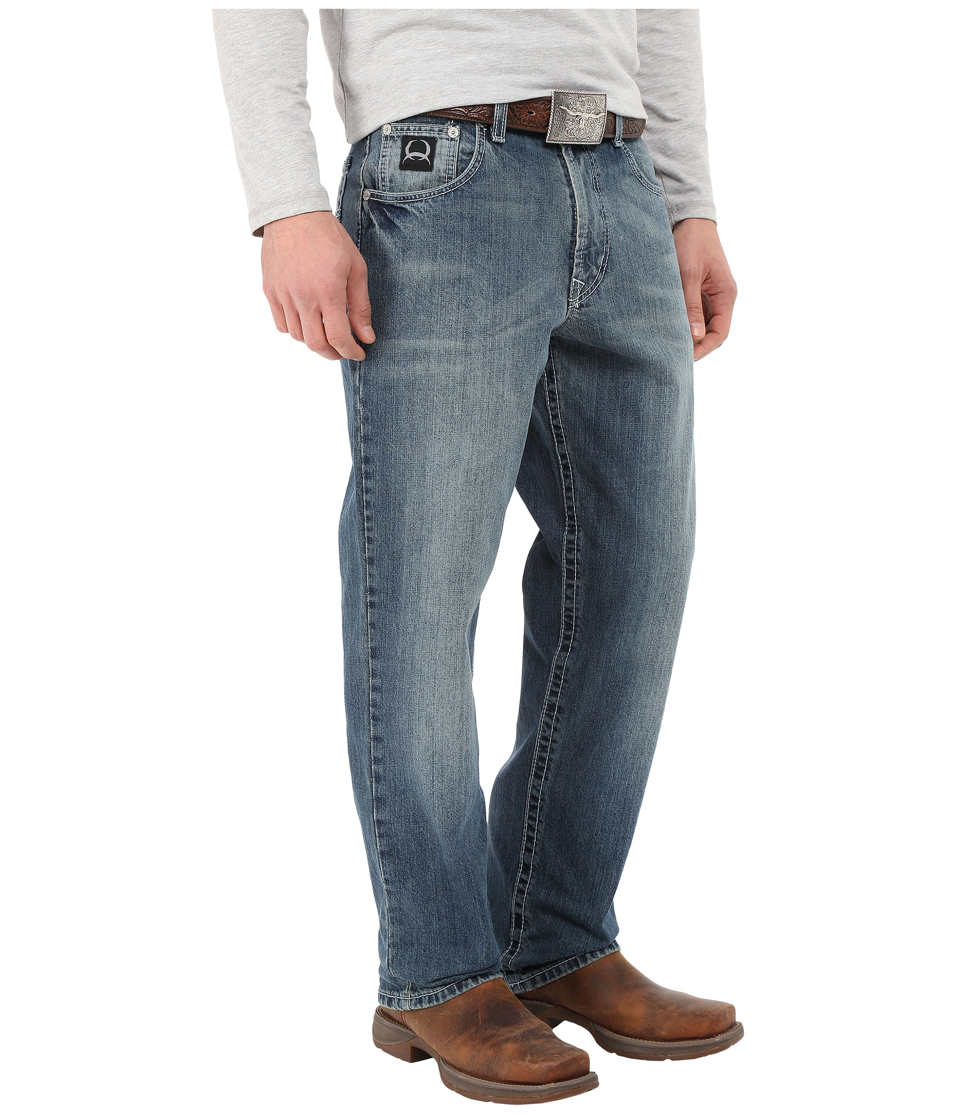Click or call 800 927 7671. The black label 20 has the classic fit with style in a medium stonewash with hand sanding chevrons whiskers and tacking onthe back hem. Cinch mens jeans are tough and durable for the rodeo arena or life on the ranch yet fashionable enough for a night on the town alongside a pair of cowboy boots and western shirt.