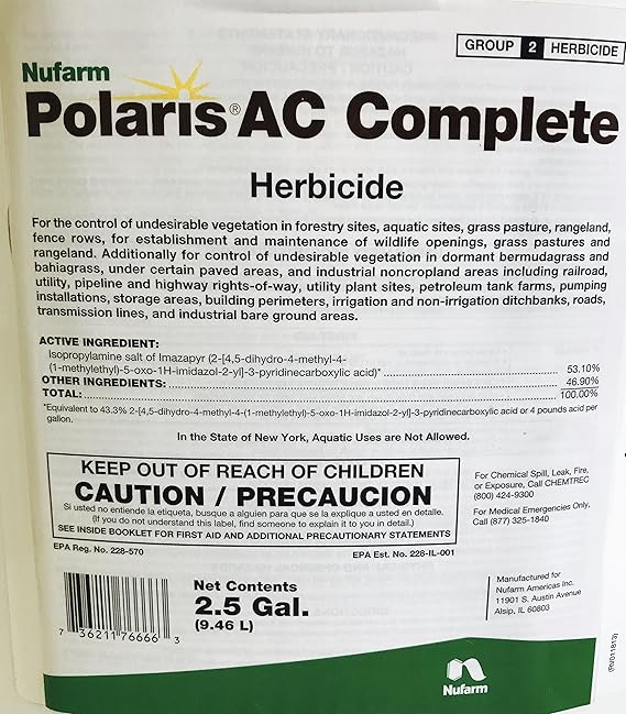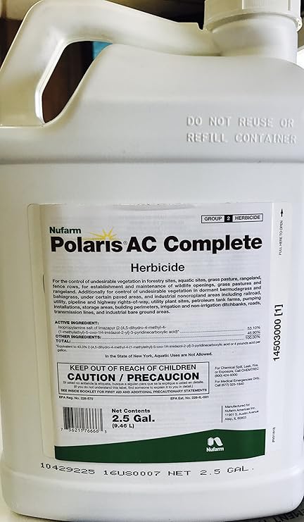 Polaris herbicide is a liquid post emergent herbicide that contains imazapyr for effective management of grasses and broadleaf weeds undesirable emergent and floating aquatic vegetation and many brush and vine species in a variety of settings. Polaris ac complete herbicide 25 gallons imazapyr. Buy inputs the easy way with fbn direct and enjoy transparent pricing and an unbiased product list which includes labels and other product information.