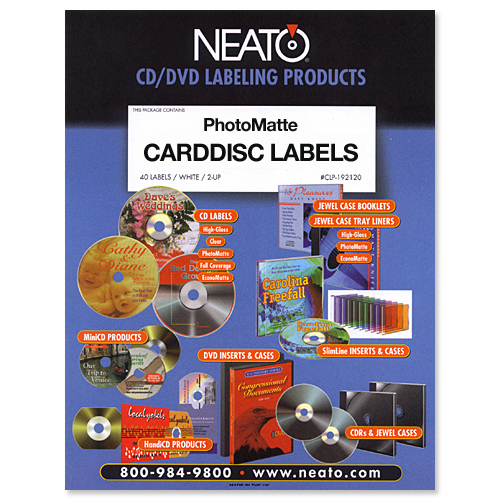 Neato cddvd labels photomatte photo quality finish 100 disc labels and 200 spine core and utility labels. They feature a matte finish perfect for inkjet and most laser printers so your custom discs can have professional quality labels. 2 sheets of economatte full coverage cddvd labels.
