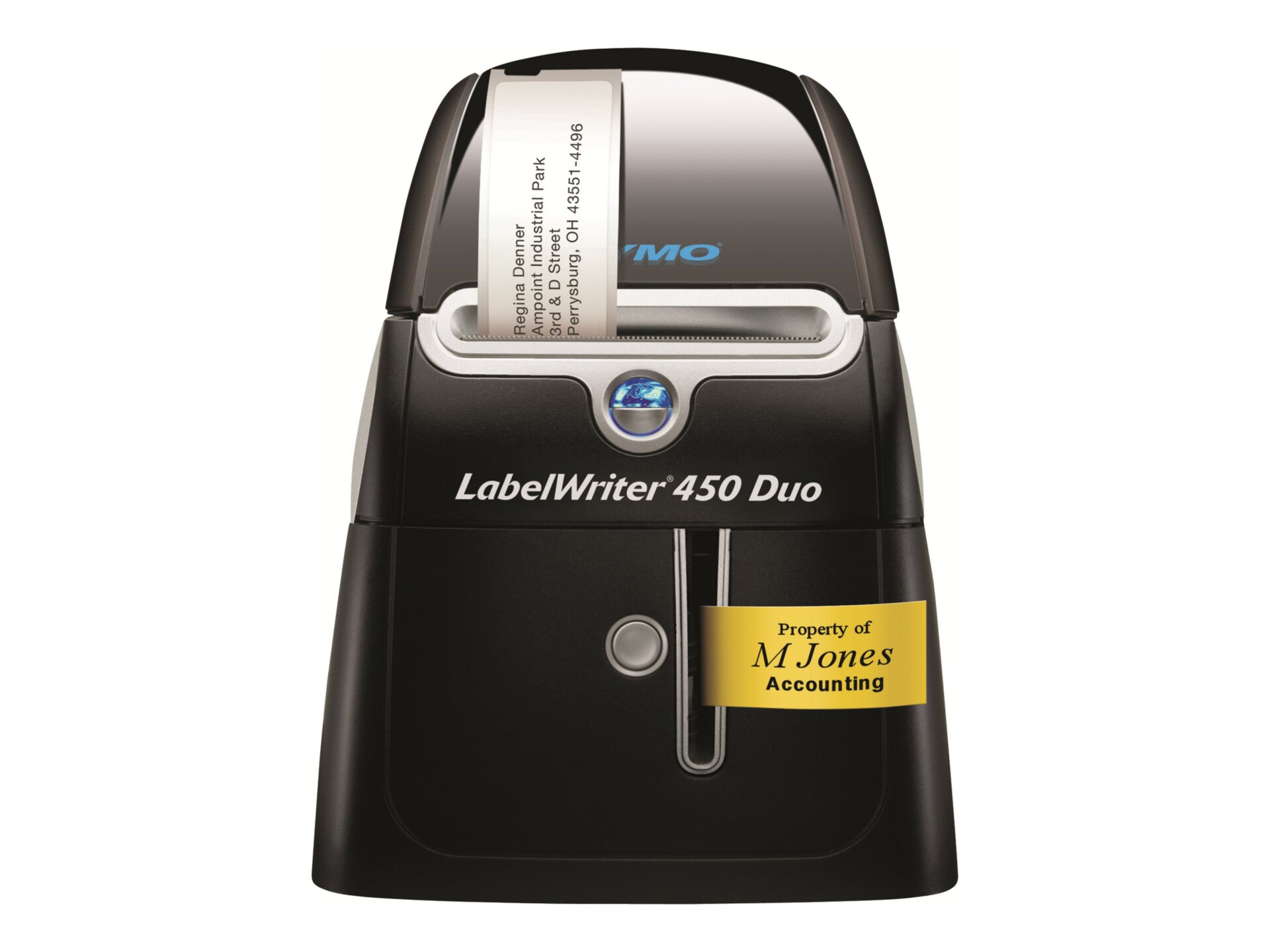 Dymo labelwriter 450 duo label printer. Dymo labelwriter 450 duo label printer print multiple types of labels our most versatile label printer the dymo labelwriter 450 duo prints lw labels plastic d1 labels and durable ind labels so that you can take on virtually any labelling job. Our most versatile label printer the dymo labelwriter 450 duo prints lw labels for addresses mailing shipping file folders name badges and more. The dymo labelwriter 450 duo label printer is compatible with almost all dymo labelwriter labels the exception being dymo 4xl extra large labels it is also compatible with all dymo d1 label cartridges it is 100 compatible with dymo stamps.